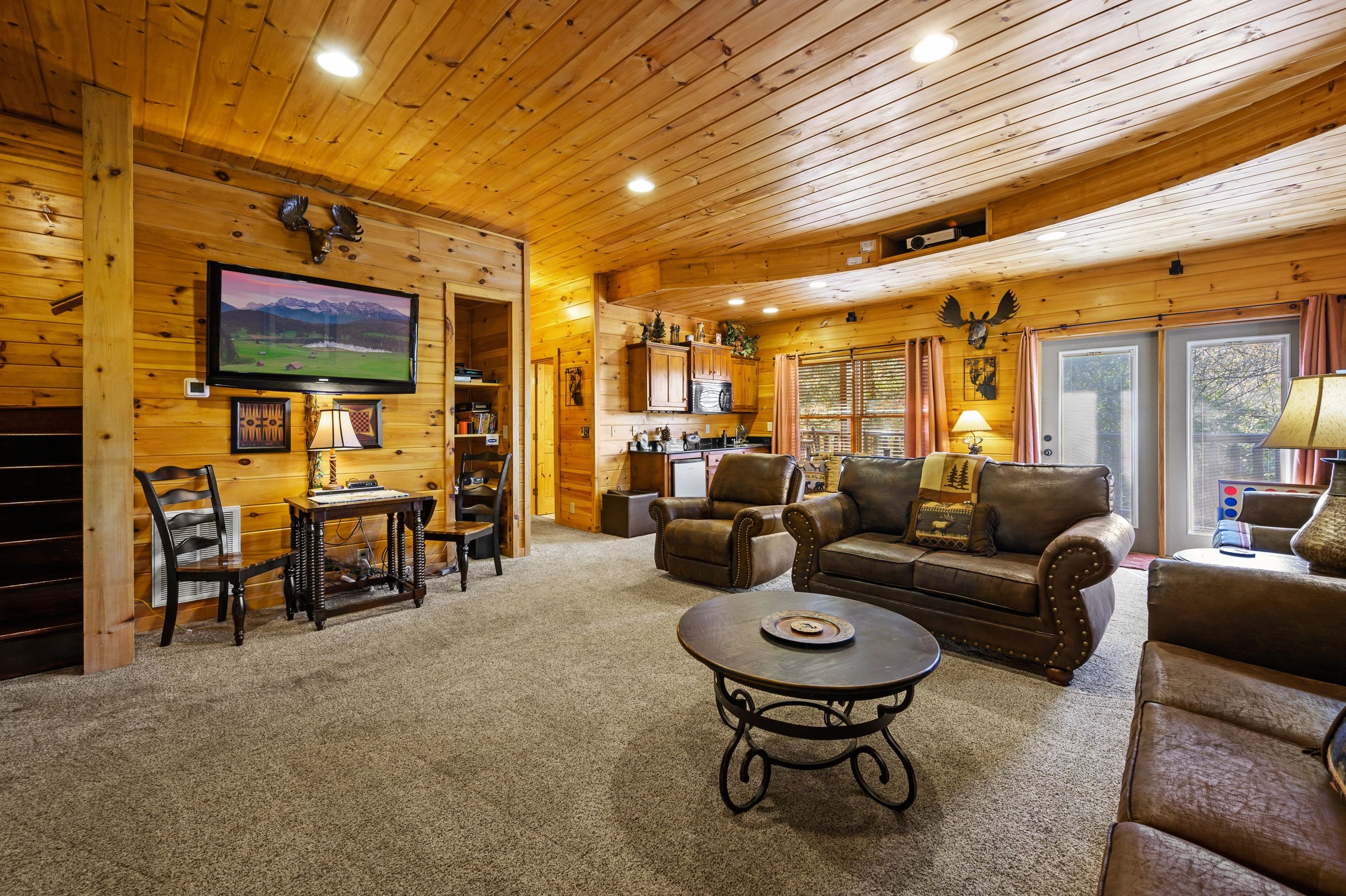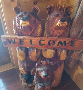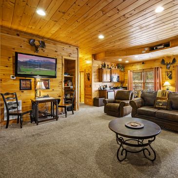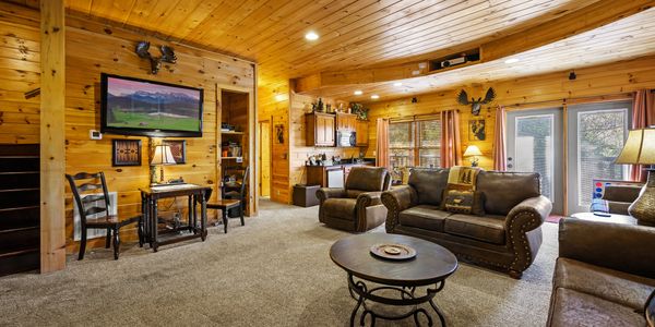 Ain't Moose Behavin' is located in Alpine Mountain Village, just seconds off the parkway, in the heart of Pigeon Forge, and just a few minutes from Gatlinburg and all the major attractions. Cook dinner in the fully accessorized kitchen, on the gas or charcoal grill and then relax in the rockers or climb in the hot tub overlooking the beautiful view of the mountains. Then unwind watching a movie in the theater room. 9' BOSE HOME THEATER with incredible surround sound or use your iPad to surf the web. The cabins interior was professionally decorated with unique furniture, a stacked stone gas fire place, and tasteful moose décor. On the main level there is a king suite with Jacuzzi tub and full bath with access to the wraparound deck and hot tub. On the third floor enjoy the pool table in the loft, and another king suite with Jacuzzi tub, full bath and private deck with breath taking views. Downstairs completes this spacious and fabulous cabin with yet another king suite with a Jacuzzi tub and full bath. On this floor also enjoy the privacy of a separate living area with a sectional couch with a sleeper and recliners along with an additional queen sleeper, wet bar with granite top, refrigerator, microwave, wrap around deck, Wii gaming system, and another full bath. Make plans now to retreat to Ain't Moose Behavin' for your next getaway to the Smokies and experience the vacation of a lifetime! Don't forget to bring your DVD's and popcorn for the Home Theater System! Alpine Mountain Village is located 2 minutes from the parkway at traffic light number #1 in Pigeon Forge. Only 2.6 miles from the new Cal Ripken Experience - baseball/softball stadium complex.